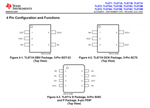 前のお知らせで「安価ながらバイアス電流が少ない」ということでTL071Hを紹介しましたが、シングルの5ピン・オペアンプでは8ピンのオペアンプのようにピンレイアウトのルールは決まっていません!